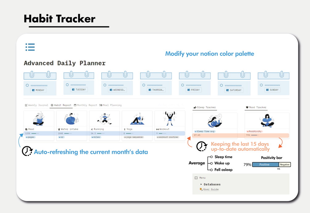 The template include 5 habits dashboards: