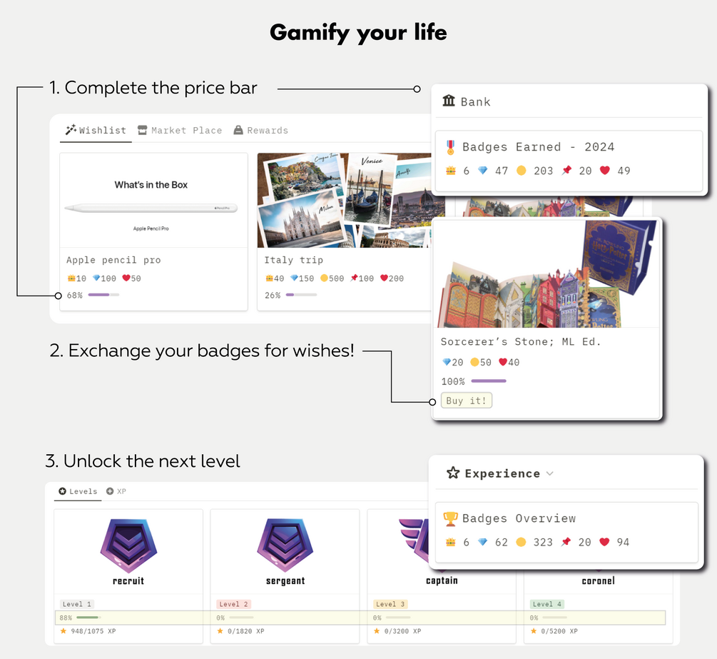 Gamify your Habit Tracker is digital system in Notion which do not simply track your good habits. Also, help you to break bad habits, reach your goals and keep motivated with a gamified system.