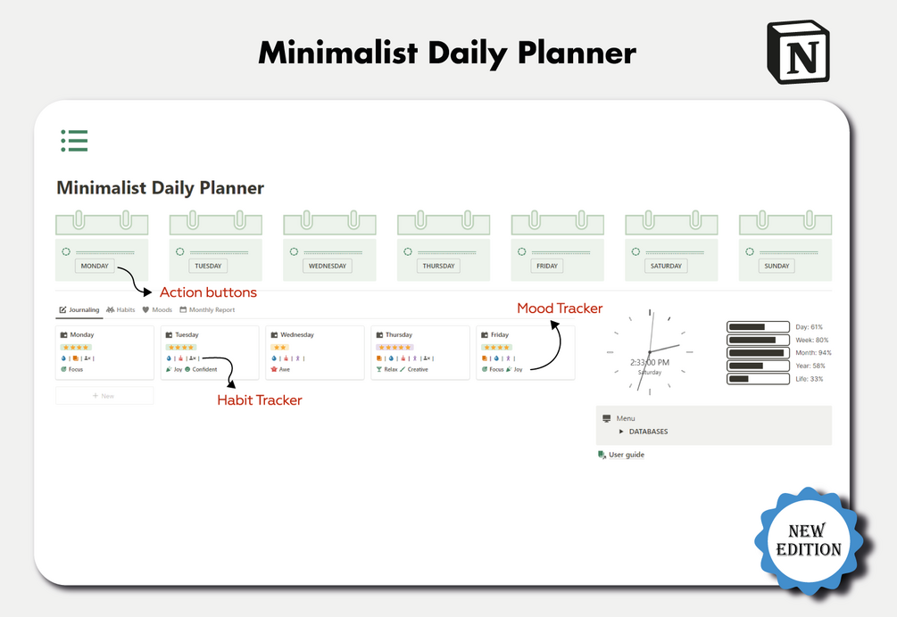 - Use the new action buttons to track your habits and moods in a minimalist way.