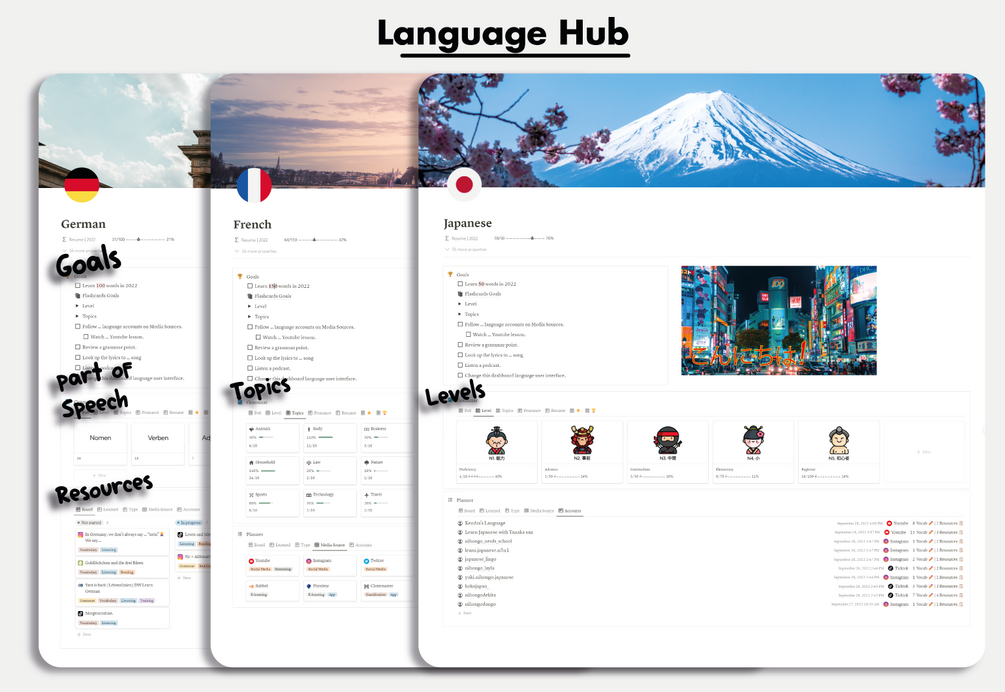 This Language Hub template is a great choice for anyone who wants to learn a new language or improve their existing skills. It is a Notion template that helps you manage your learning resources, track your daily studying, and review your vocabulary with flashcards and practice with a spaced repetition system.