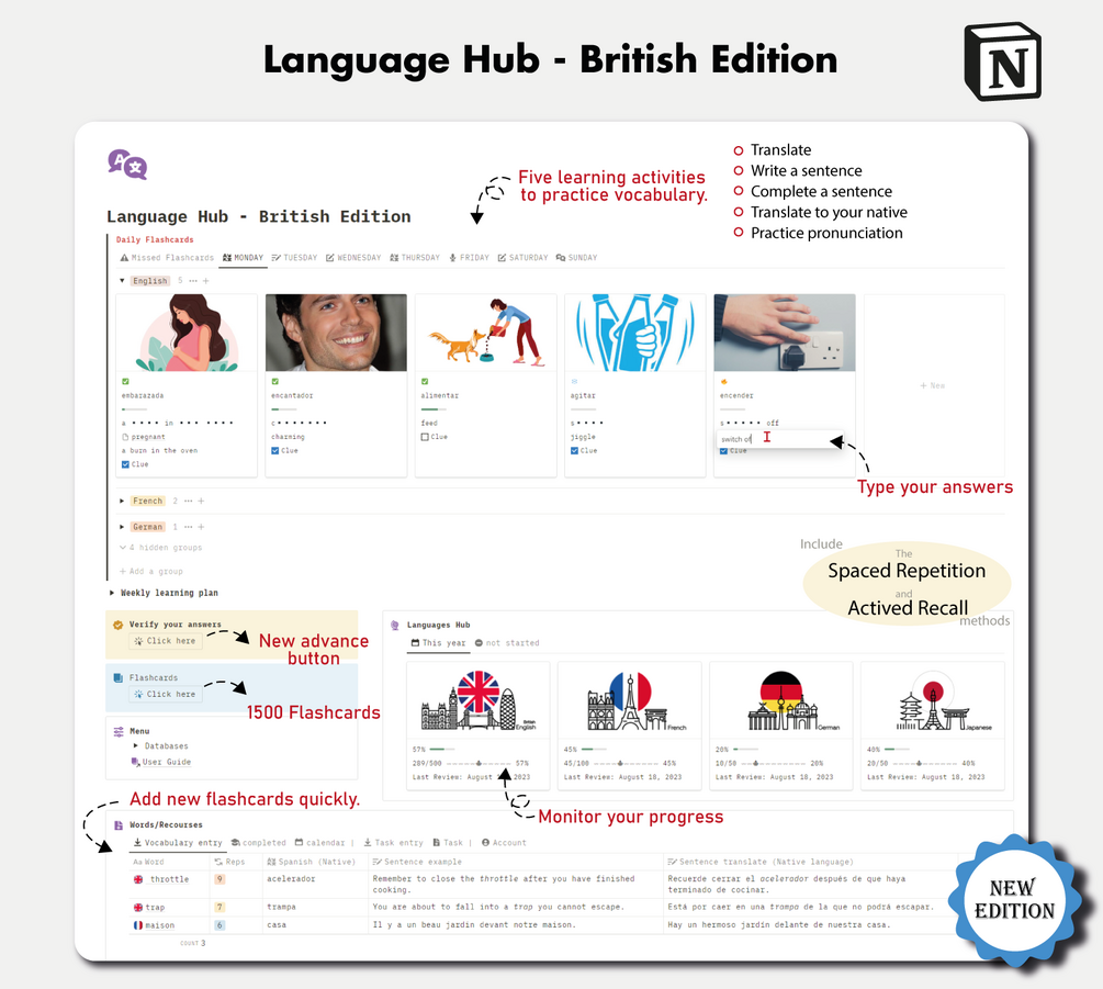This Language Hub template is a great choice for anyone who wants to learn a new language or improve their existing skills. It is a Notion template that helps you manage your learning resources, track your daily studying, and review your vocabulary with flashcards and practice with a spaced repetition system.
